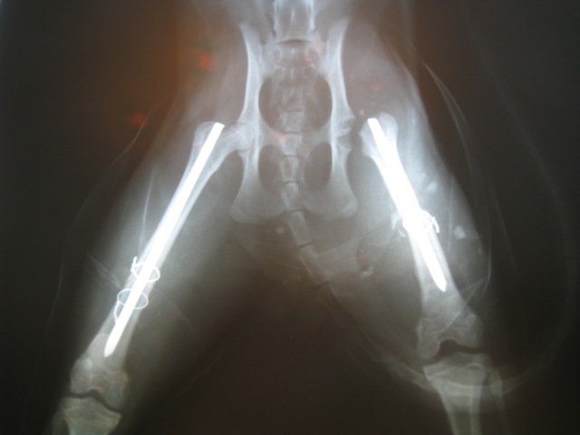 تاریخچه: گربه حمایتی پیدا شده توسط حامی احتمالاً به دلیل تصادف با وسیله نقلیه از ناحیه استخوان ران هر دو پا و مفصل رانی لگنی دچار شکستگی شده بود که در طی سه عمل جراحی در یک روز ترمیم شدند.