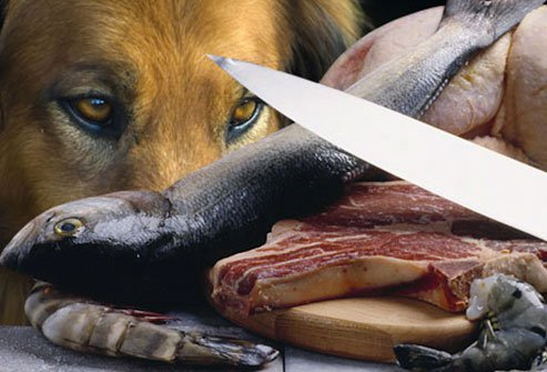 گوشت و ماهی خام مانند تخم مرغ خام می توانند بیماری های باکتریایی و ویروسی را به سگ منتقل کنند. علاوه بر این برخی از ماهی ها مانند سالمون، آزاد، قزل آلا و استروژن می توانند نوعی انگل را که عامل بیماری ماهی در سگ ها است به سگ منتقل کنند که می تواند در عرض دو هفته منجر به مرگ سگ شود. علائم اولیه آن عبارتند از: تهوع، تب و بزرگ شدن غدد لنفاوی. پختن کامل ماهی منجر به از بین رفتن این انگل می شود.